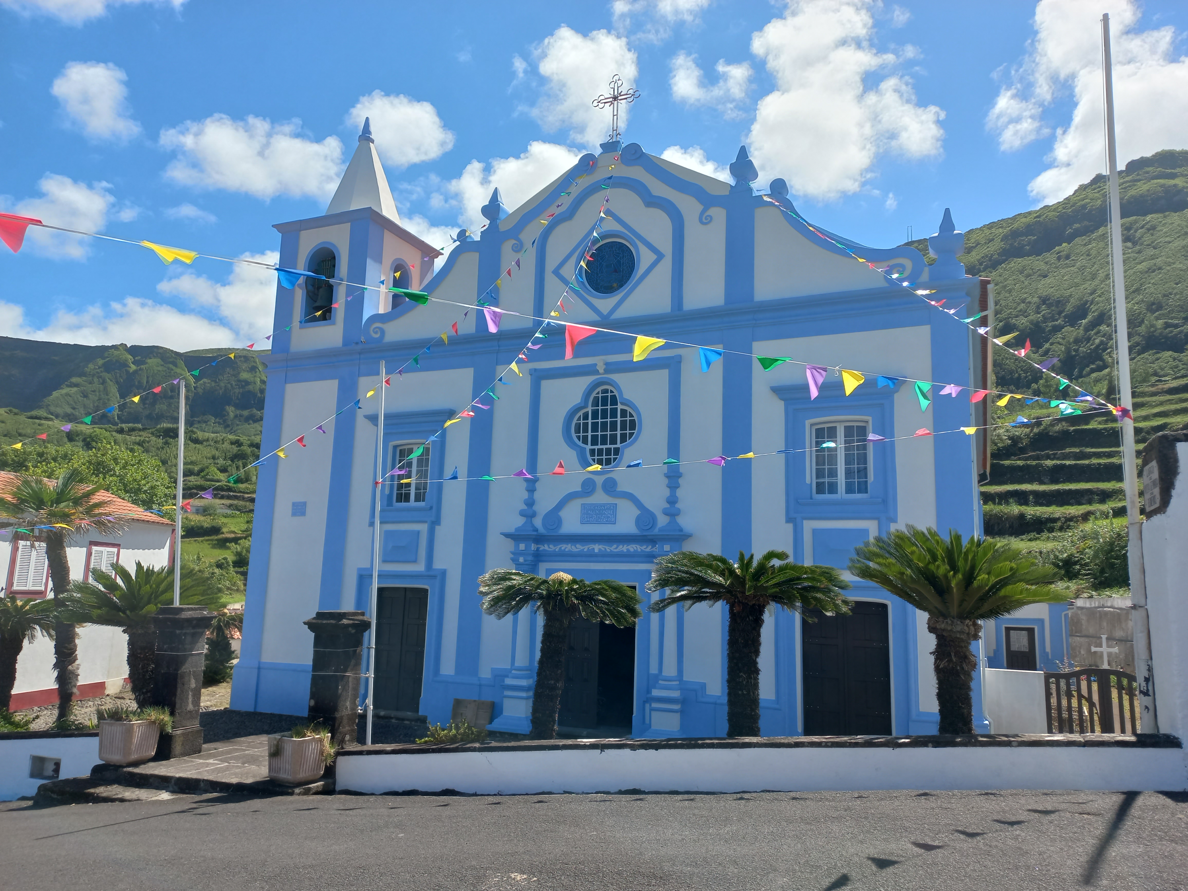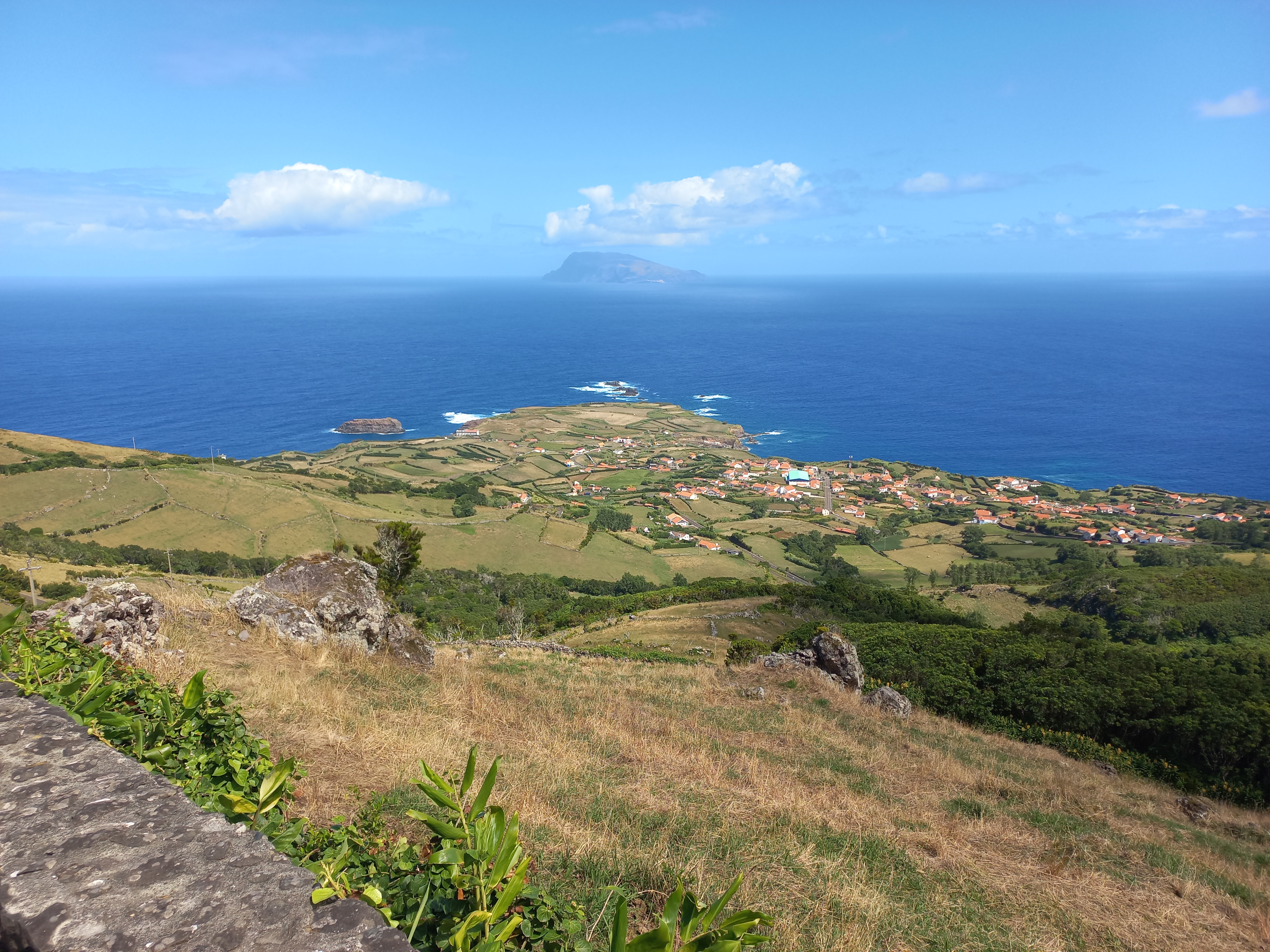 Der Ort Ponta Delgada im Norden ist über die kurvenreiche Landstraße zu erreichen. Außer einer Kirche gibt es ein Cafée und einen Campingplatz. Die Insel Corvo immer in Sicht.